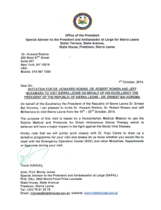 Dr. Howard Robins, Dr. Robert Rowen and Jeff McNamara have been formally invited to Sierra Leone by its president, Dr. Ernest Bai Koroma.